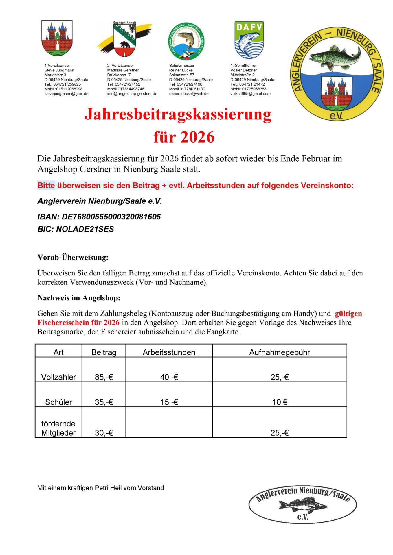 Jahresbeitragskassierung bis Ende Februar im Angelshop Gerstner