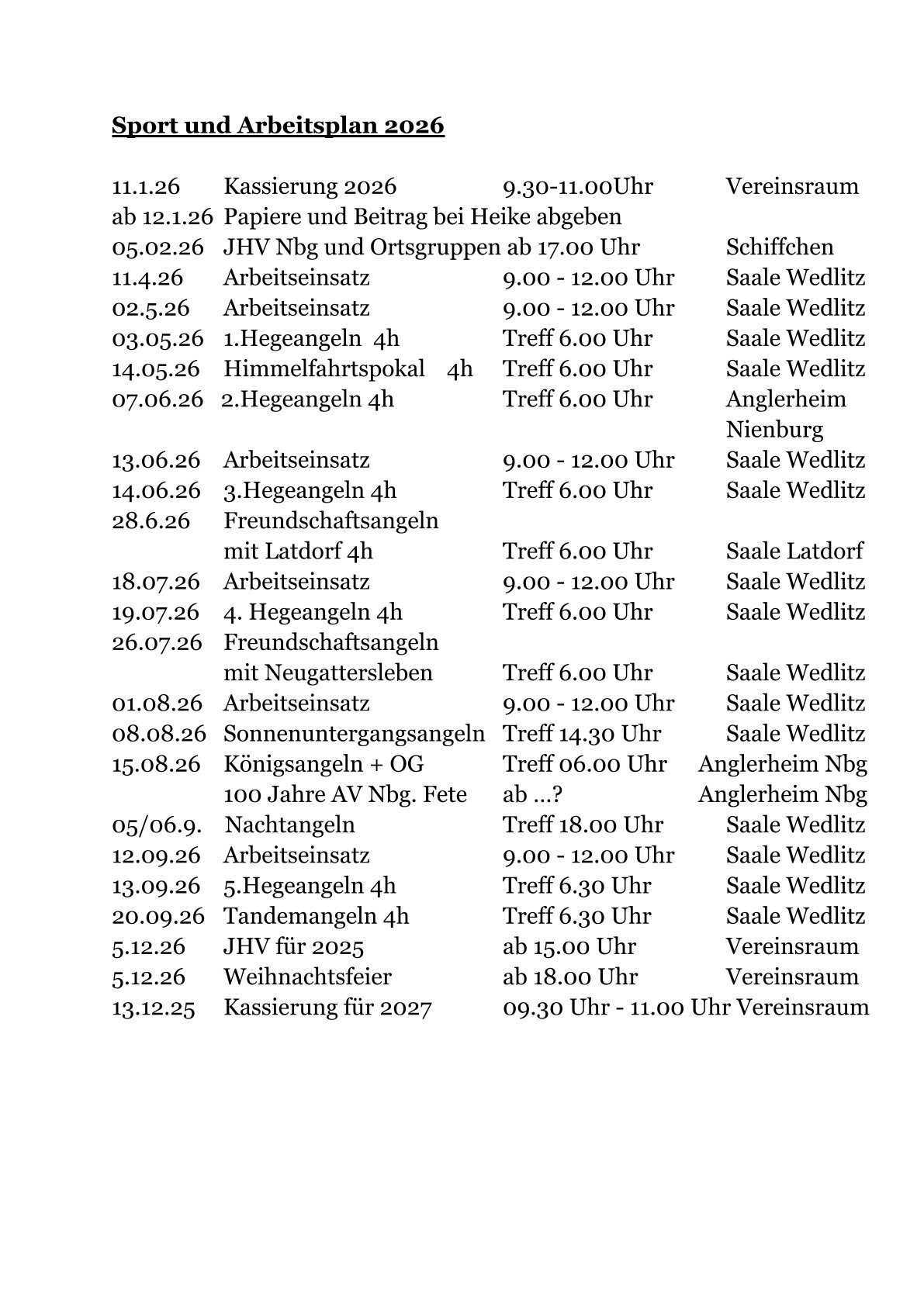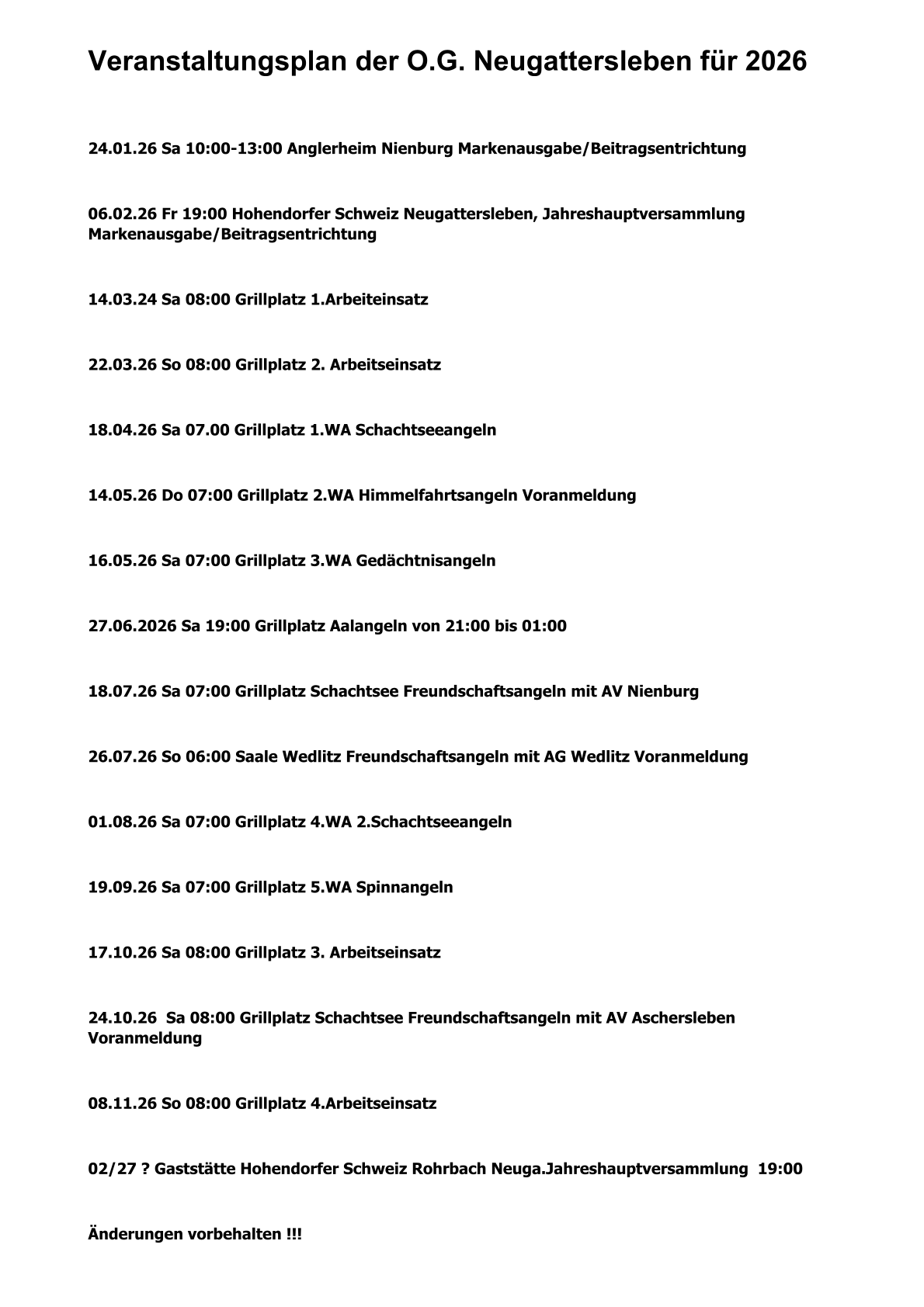 Veranstaltungspläne 2026 KontaktVeranstaltungspläne 2026Veranstaltungsplan Anglergruppe Nienburg/Saale 2026 Veranstaltungsplan Jugendgruppe Nienburg/Saale 2026 Veranstaltungsplan OG Wedlitz 2026 Veranstaltungsplan OG Neugattersleben 2026 Anglerverein Nienburg/Saale