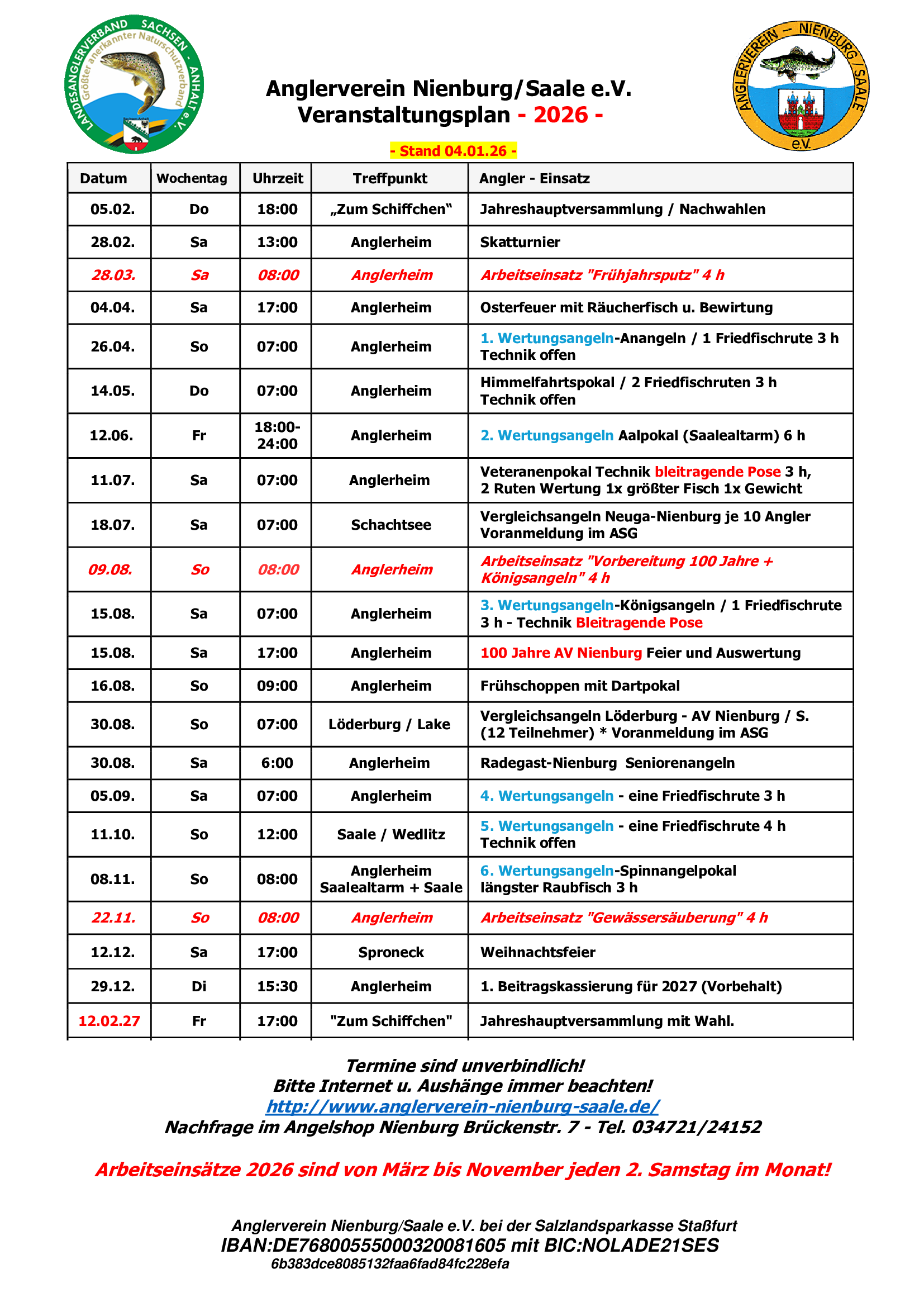 Veranstaltungsplan Jugendgruppe Nienburg/Saale 2026